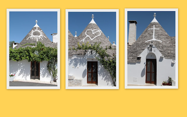 I love Alberobello! When we lived in Italy we went often enough with family and friends and we always had fun that it quickly became a favorite spot. Some trulli houses have painted symbols, some are stores, some are restaurants or bars and some are just plain ol' houses. Each is unique in its own way.